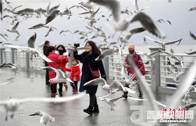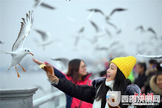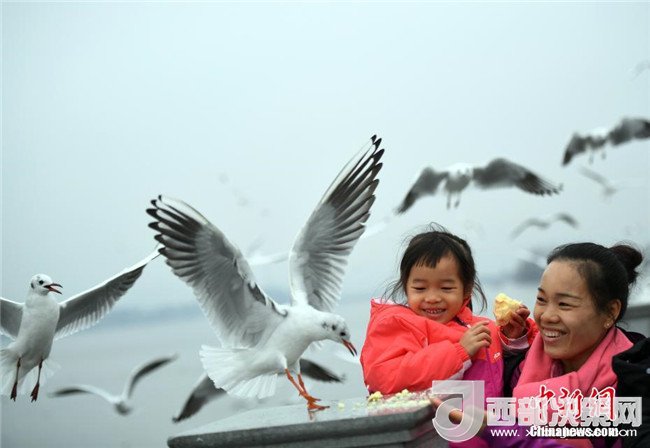 2月4日,市民穿著厚厚的冬裝在昆明滇池邊給紅嘴鷗喂食。當(dāng)日,受較強冷空氣影響,“春城”昆明最低氣溫下降至-3℃。天氣雖然寒冷,卻抵擋不住市民和游客前來滇池觀賞、喂食越冬紅嘴鷗的熱情。中新社記者李進(jìn)紅攝