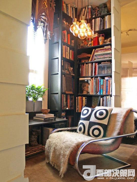 一個局促的轉(zhuǎn)角,被打造成了藏書空間,黑色的書架顯得厚重大氣,塞滿書本以后更有沉淀韻味。坐在舒適的躺椅上閱讀,體驗有滋有味的生活。