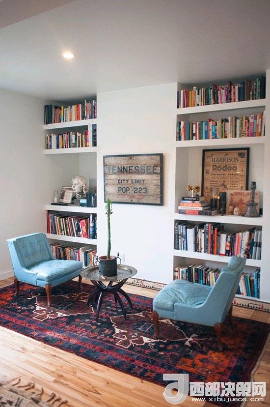 在墻面上掏出置物空間,讓書籍切切實實地成為家的一部分,左右對稱的設(shè)計十分美觀,旁邊的兩把單人沙發(fā)相對而坐,兩個人的書房要來得更加溫馨。