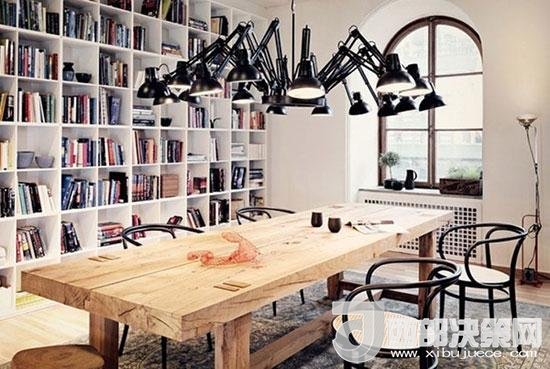布滿整面墻的方格書架,不但空間充足而且便于分類。房間中央是一張大工作臺,工作、讀書都可兼顧,頗有幾分家庭圖書館的氣勢。