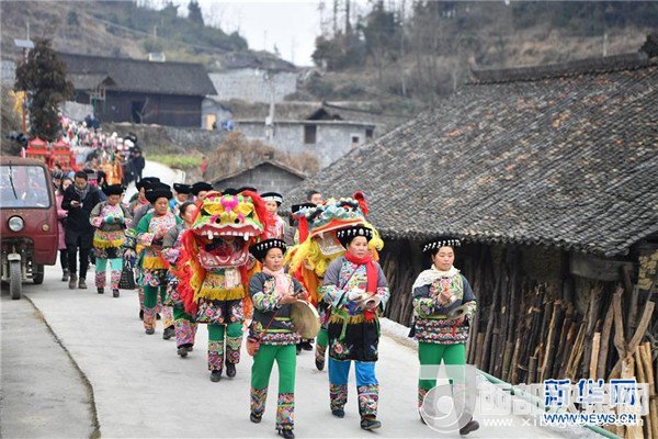 在湖南省湘西土家族苗族自治州花垣縣十八洞村,接親隊伍在行進中(2月4日攝)。