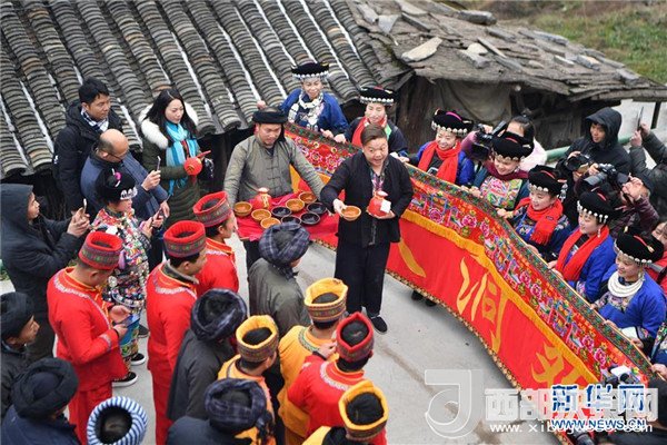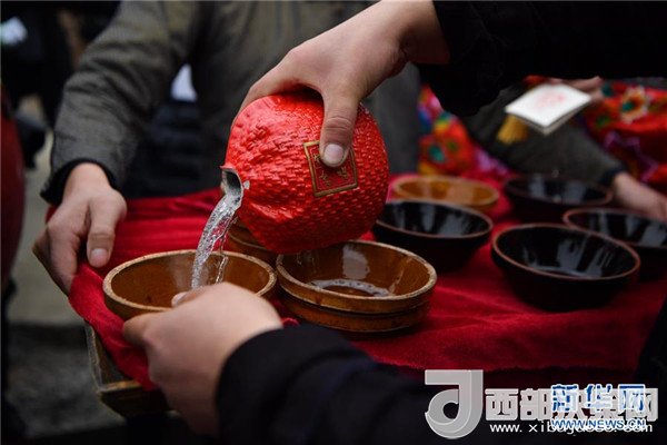 2月4日,在湖南省湘西土家族苗族自治州花垣縣十八洞村,新娘的親友為接親隊伍倒上攔門酒。