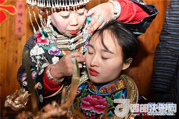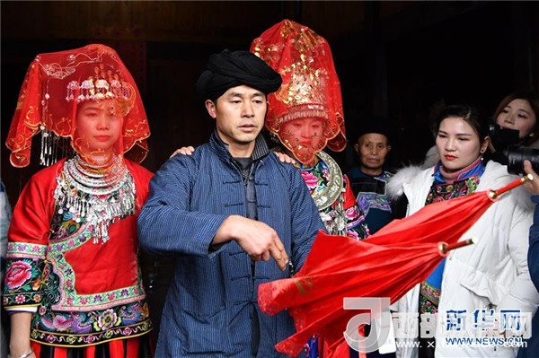 2月4日,在發(fā)親前,婚禮主持人手持紅傘為她們祈福。苗族人婚禮時用紅傘代替紅蓋頭,傘與“散”諧音,取開枝散葉之意,同時傘能為人遮風避雨,寓意為新娘遮風擋雨。