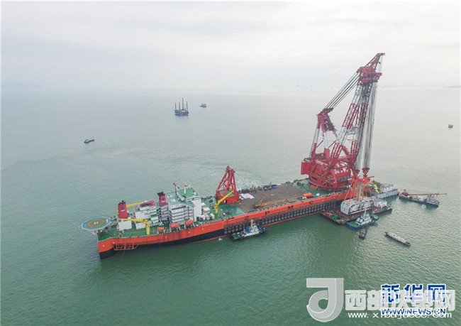 “振華30”起重船吊起重港珠澳大橋島隧工程海底隧道的最終接頭,準備放置到預定位置(2017年5月2日攝)。 記者 劉大偉 攝
