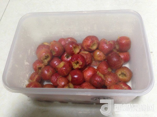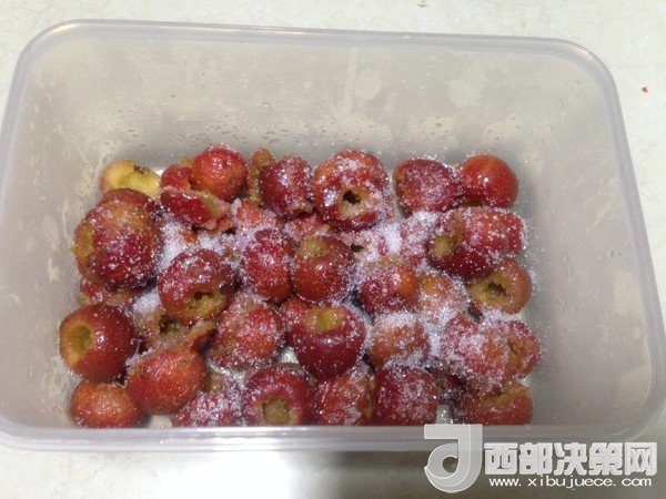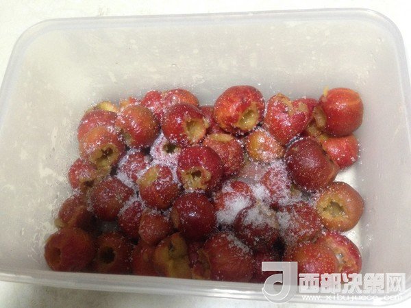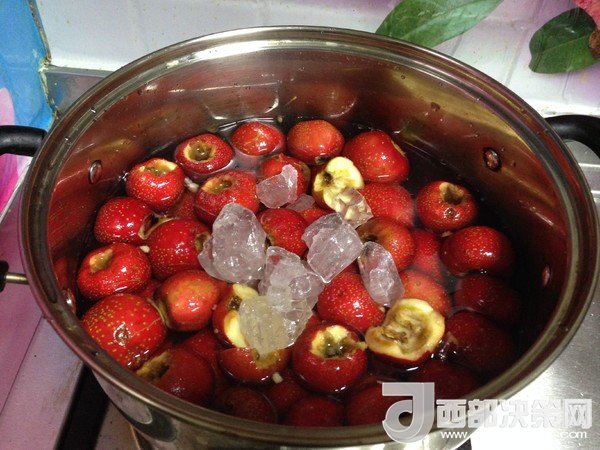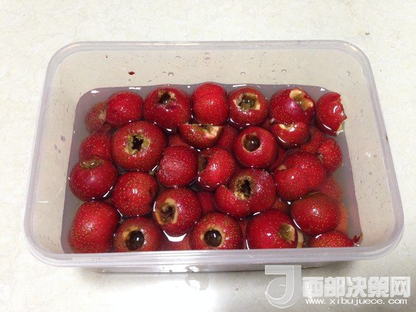 2、去完核的山楂,放鹽水中泡15分鐘,可起到固色的作用。