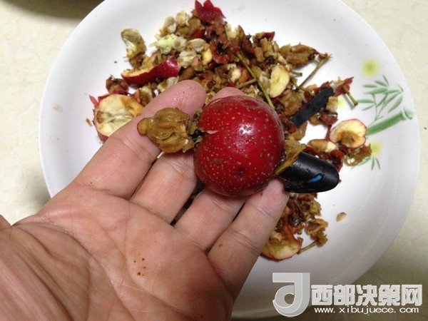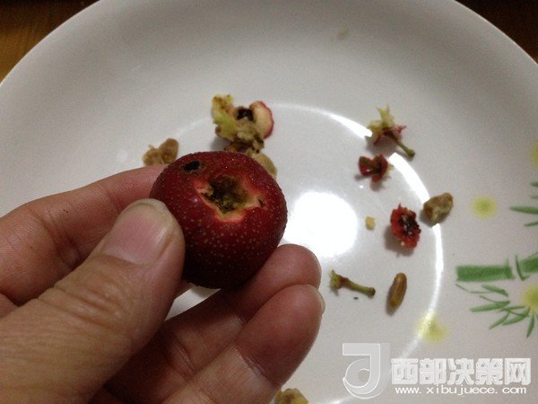 3.找一個廢筆桿,用筆桿從一端穿過,山楂核就被輕松去掉了