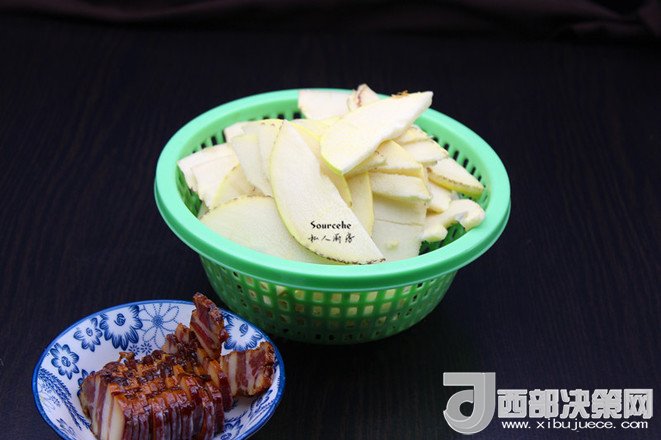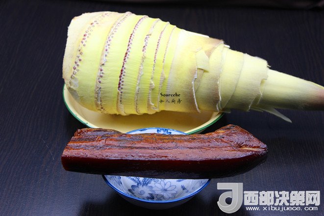 1.新鮮的筍去殼,洗凈,準(zhǔn)備臘肉;PS:照片中筍不止500克
