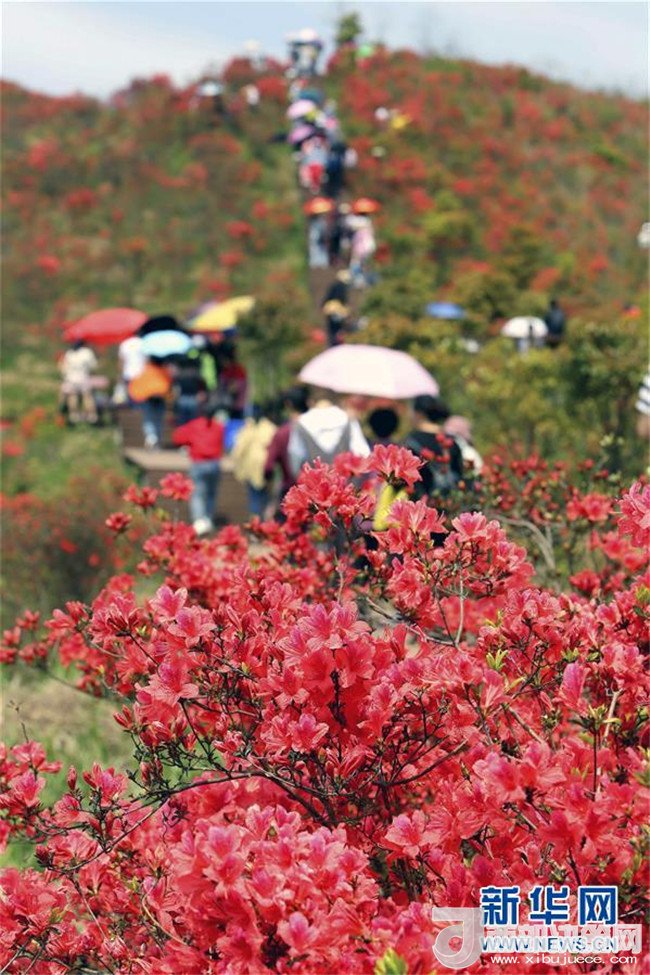 4月10日,游客在安徽銅陵鐘鳴鎮(zhèn)杜鵑山上賞花游玩。 新華社發(fā)(過仕寧 攝)