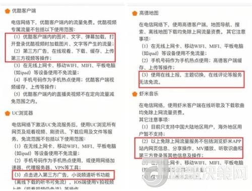 以優(yōu)酷和中國電信合作的“大小魚卡”為例,其說明顯示,“優(yōu)酷視頻專屬流量不包括優(yōu)酷客戶端內圖片、文字、彈幕加載、打開優(yōu)酷視頻時加載圖片、文字等產(chǎn)生的流量。”當然,第三方廣告也不在內。