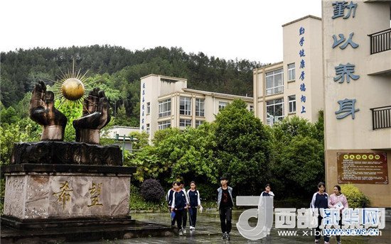 木魚(yú)中學(xué)的學(xué)生們從校園里的“希望”雕塑前走過(guò)(4月24日攝)。