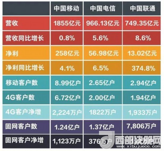 三大運營商在各方面皆呈增長態(tài)勢。移動的營收、凈利雖高,但其營收同比增長率僅為0.8%。聯(lián)通的凈利潤同比增長率高達374.8%,營收同比增幅也是最高,混改成效顯著。