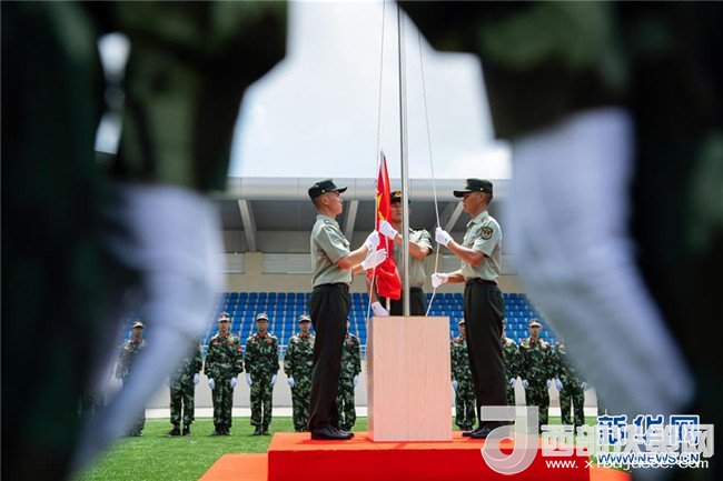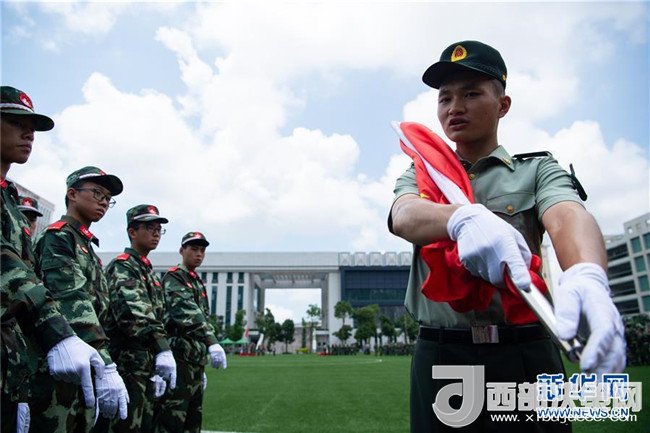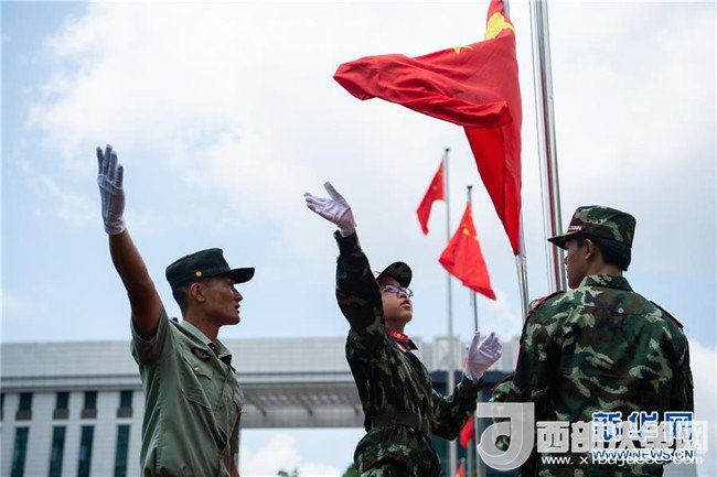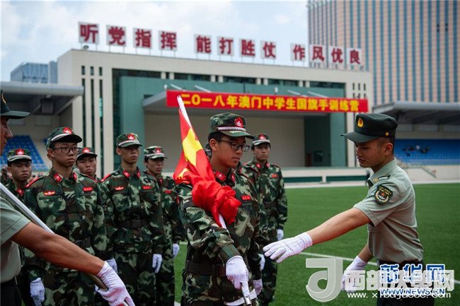 當(dāng)日,“國旗下的說話·2018年澳門中學(xué)生國旗手訓(xùn)練營”舉行。來自30所澳門中學(xué)的300余名中學(xué)生會(huì)聚解放軍駐澳門部隊(duì)氹仔軍營,在迷彩的青春方陣中親手升起鮮艷的五星紅旗。新華社記者張金加攝