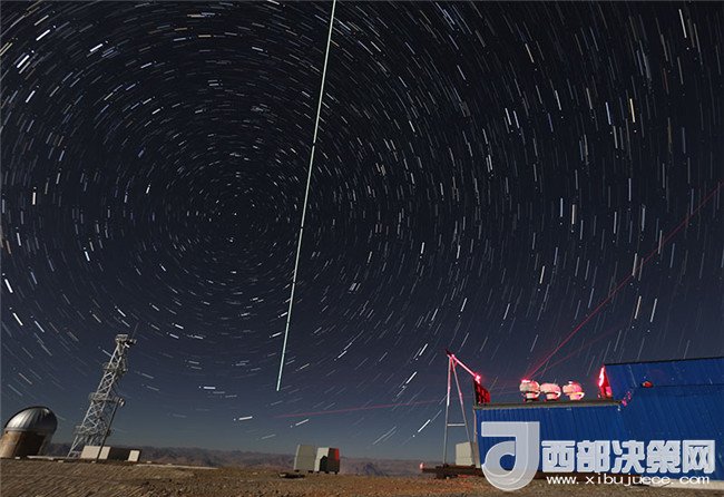 在西藏阿里觀測(cè)站,“墨子號(hào)”量子科學(xué)實(shí)驗(yàn)衛(wèi)星過(guò)境,科研人員在做實(shí)驗(yàn)(2016年12月10日攝,合成照片)。新華社記者 金立旺 攝