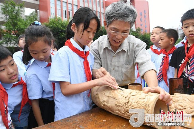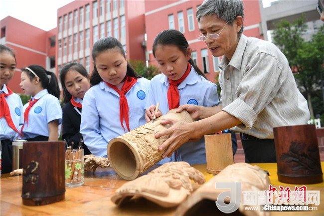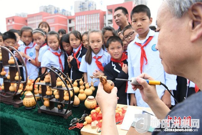 5月28日,為弘揚(yáng)中華民族優(yōu)秀傳統(tǒng)文化,迎接“文化與自然遺產(chǎn)日”的到來(lái),重慶舉行“多彩非遺、美好生活”為主題的非遺進(jìn)校園系列活動(dòng)。圖為學(xué)生參觀葫蘆烙畫(huà)。 陳超 攝