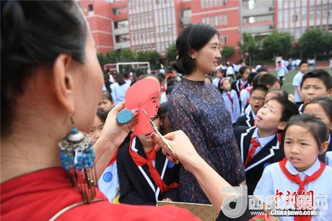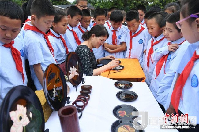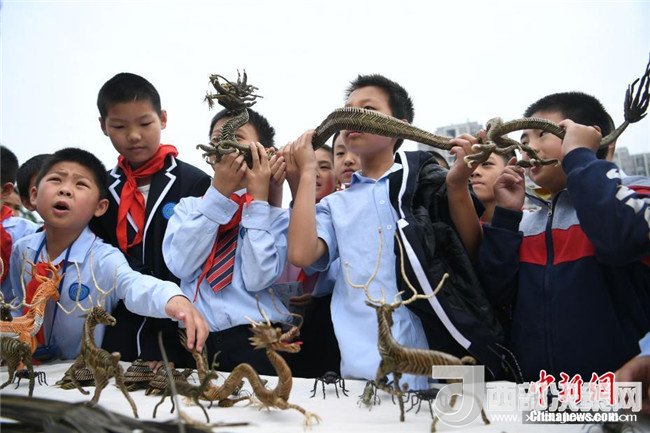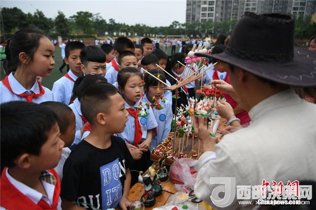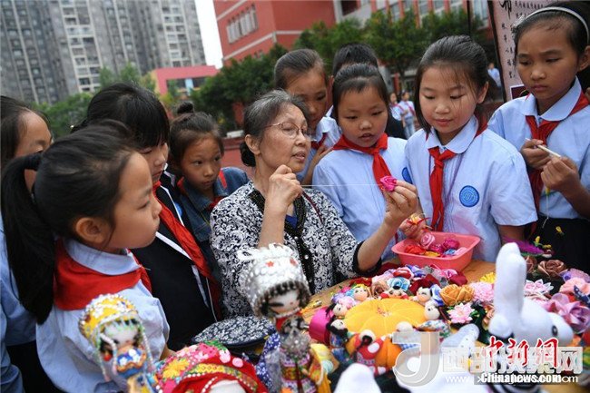 活動(dòng)現(xiàn)場(chǎng),15個(gè)國(guó)家級(jí)和市級(jí)非物質(zhì)文化遺產(chǎn)項(xiàng)目為重慶沙坪壩西永第一小學(xué)校的師生帶來(lái)一場(chǎng)豐盛文化遺產(chǎn)大餐,讓師生們近距離感受了中華優(yōu)秀傳統(tǒng)文化的魅力。圖為活動(dòng)現(xiàn)場(chǎng)學(xué)生們參觀非物質(zhì)文化遺產(chǎn)項(xiàng)目。 陳超 攝