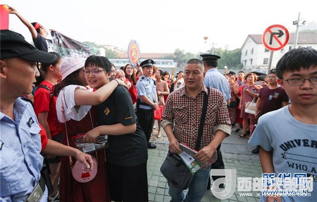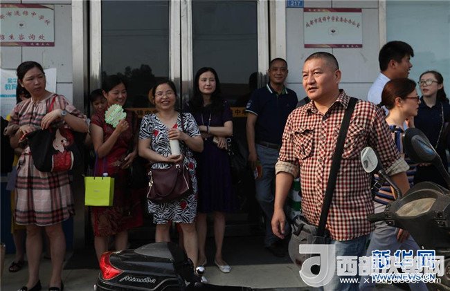 6月7日,在2018年高考成都通錦中學(xué)考點,梁實(前右)吸引考生家長的目光。新華社記者 江宏景攝