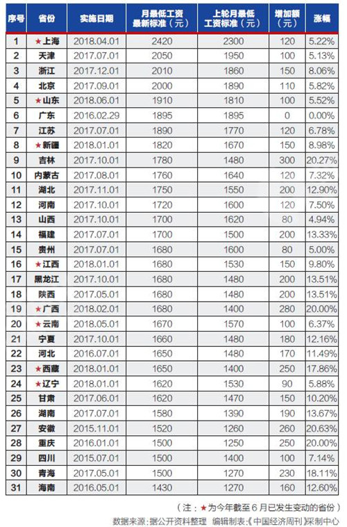 《中國經(jīng)濟(jì)周刊》記者計(jì)算得出,2018年上調(diào)最低工資標(biāo)準(zhǔn)的8個(gè)省份,平均調(diào)增幅度為9.95%,僅廣西(20.00%)、西藏(17.86%)兩省份的調(diào)增幅度超過了11%的平均數(shù),廣西的增加額最大,達(dá)280元,西藏的增加額也達(dá)到了250元。