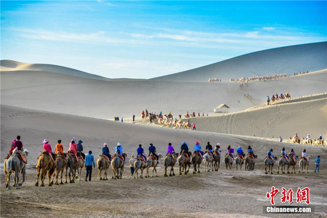 甘肅敦煌端午小長(zhǎng)假迎旅游高峰 逾12萬人暢游大漠