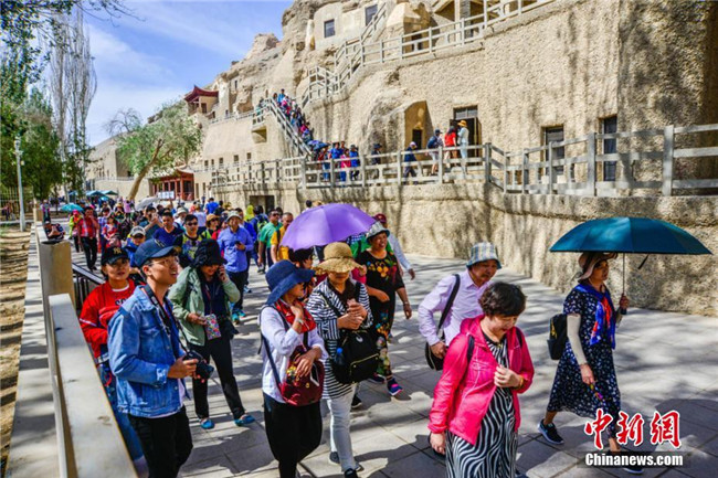 莫高窟標(biāo)志性建筑“九層樓”前的游人如織。王斌銀 攝