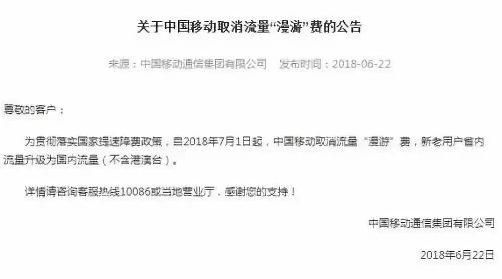 6月22日,中國(guó)移動(dòng)、中國(guó)聯(lián)通和中國(guó)電信先后宣布自7月1日起取消流量“漫游”費(fèi),手機(jī)用戶省內(nèi)流量升級(jí)為國(guó)內(nèi)流量(不含港澳臺(tái))。