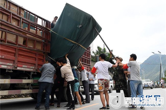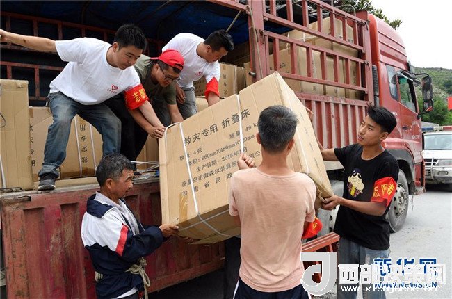 7月15日,在舟曲縣南峪鄉(xiāng),志愿者及村民從車輛上搬運救災(zāi)物資。