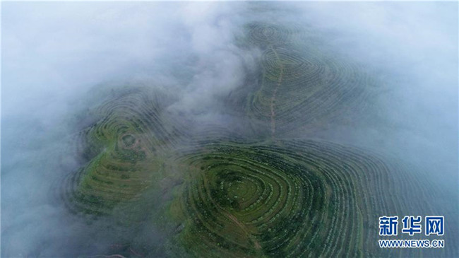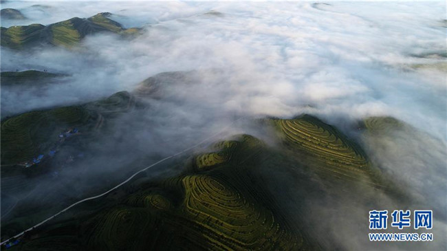 云霧繚繞的寧夏彭陽(yáng)縣金雞坪梯田公園(7月17日無(wú)人機(jī)拍攝)。新華社記者王鵬攝