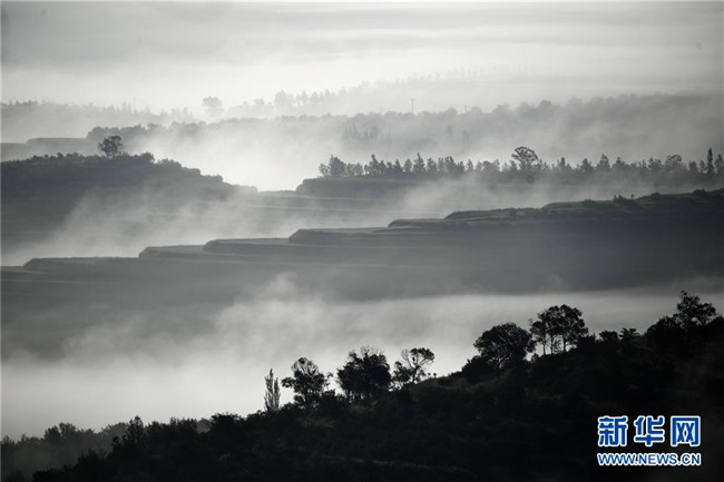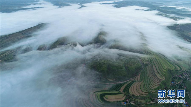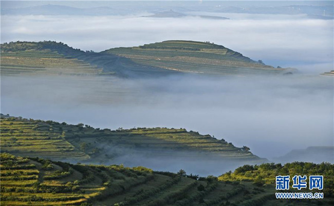 云霧繚繞的寧夏彭陽(yáng)縣金雞坪梯田公園(7月17日攝)。新華社記者王鵬攝