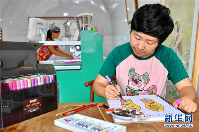 山西省臨縣寨則坪村是呂梁山上典型的貧困村。2017年5月,該村邀請縣里的老手藝人對10余位婦女進行布藝加工的集中培訓,并在村委院子里建起了布藝加工廠??恐庸じ挥挟數靥厣男瑝|、肚兜、布老虎等工藝品,這些婦女每月能拿到1500元的工資,這幫助她們順利摘下了“窮帽子”。新華社記者 曹陽 攝