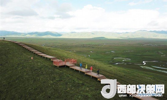 游客在瑪曲縣阿萬倉濕地的觀景步道上游覽(7月31日無人機拍攝)。 新華社記者 陳斌 攝