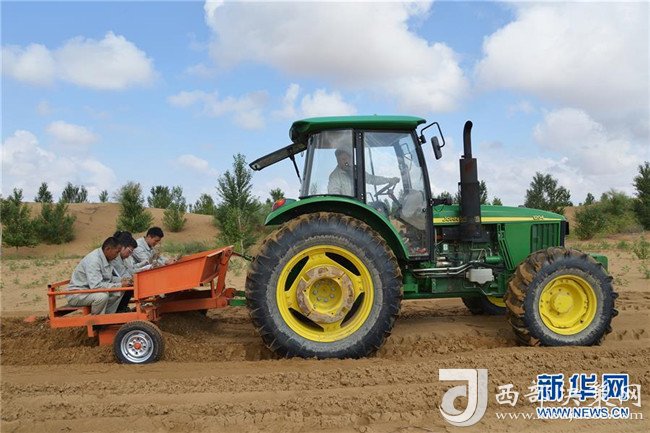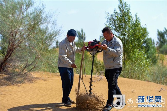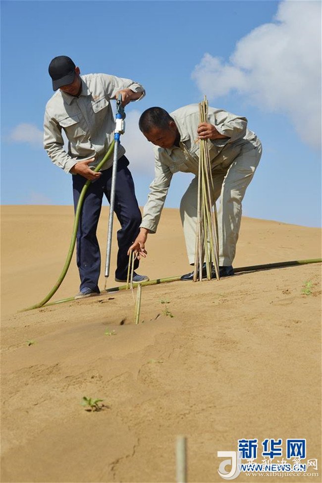 億利集團生態(tài)事業(yè)部職工在庫布其沙漠中利用螺旋鉆孔植樹法種樹(7月11日攝)。用這種方法30秒可種下一棵樹。 新華社記者 彭源 攝