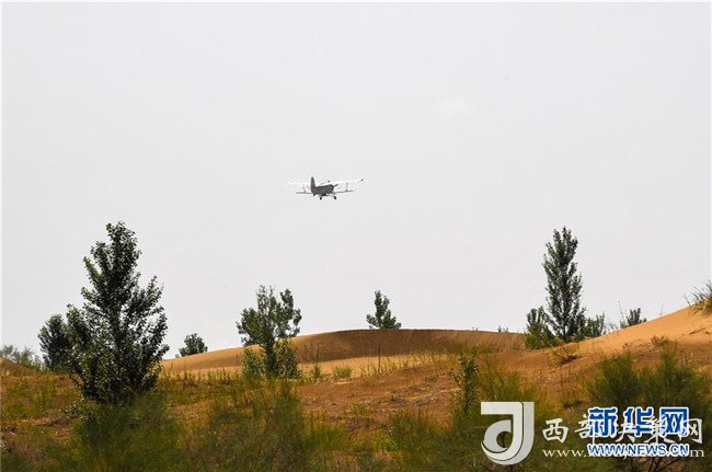 在內蒙古鄂爾多斯市的庫布其沙漠腹地,一架飛播造林用的飛機飛向沙海(7月11日攝)。 新華社記者 彭源 攝