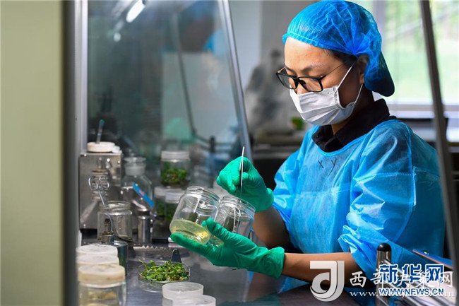 在億利集團庫布其生態(tài)科技中心的沙生植物育苗實驗室內,科研人員進行組培試驗(7月11日攝)。 新華社記者 彭源 攝