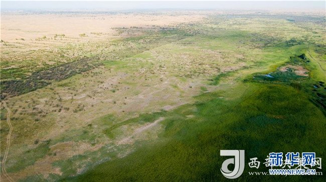 這是位于庫布其沙漠中的七星湖沙漠生態(tài)旅游區(qū)(7月11日無人機拍攝)。 新華社記者 彭源 攝