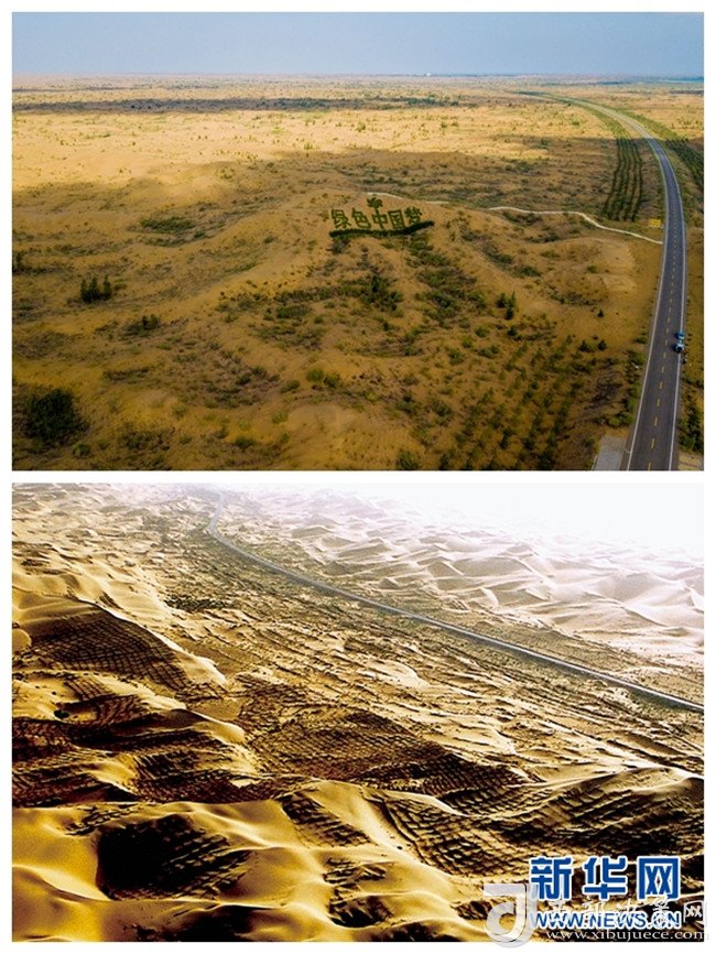 這是內蒙古鄂爾多斯市杭錦旗庫布其沙漠穿沙公路周邊環(huán)境的對比(拼版照片:上為2018年7月11日新華社記者彭源攝;下為資料照片)。 新華社發(fā)