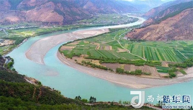 云南省麗江市石鼓鎮(zhèn)綠樹和農(nóng)田掩映下的“長江第一灣”(來源:新華網(wǎng))