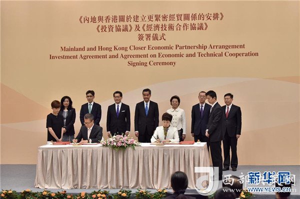 2017年6月28日在香港特區(qū)政府總部拍攝的《內(nèi)地與香港關(guān)于建立更緊密經(jīng)貿(mào)關(guān)系的安排》(CEPA)下的《投資協(xié)議》和《經(jīng)濟(jì)技術(shù)合作協(xié)議》簽約儀式現(xiàn)場(chǎng)。 新華社發(fā)(王璽攝)