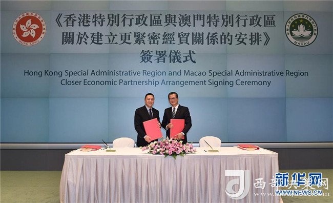 香港特區(qū)政府財政司司長陳茂波(右)和澳門特區(qū)政府經(jīng)濟財政司司長梁維特在香港簽署《香港特別行政區(qū)與澳門特別行政區(qū)關(guān)于建立更緊密經(jīng)貿(mào)關(guān)系的安排》(2017年10月27日攝)。新華社記者呂小煒攝
