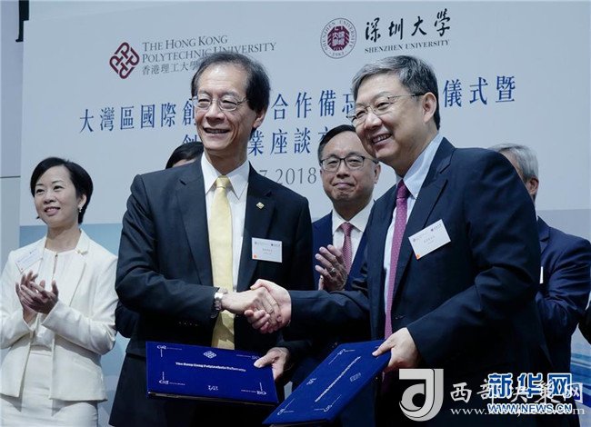 2018年7月18日,在香港理工大學(xué),香港理工大學(xué)校長唐偉章和深圳大學(xué)校長李清泉(前右)簽署“大灣區(qū)國際創(chuàng)新學(xué)院”合作備忘錄后握手。新華社發(fā)(王申攝)