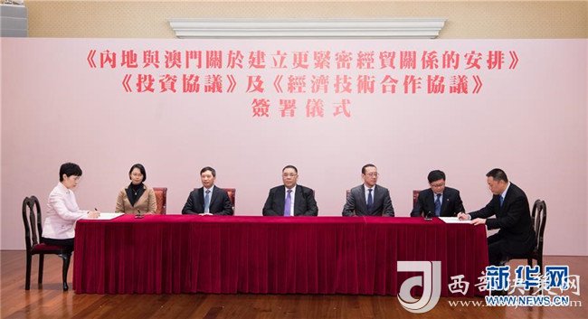 2017年12月18日拍攝的商務(wù)部與澳門特區(qū)政府《內(nèi)地與澳門關(guān)于建立更緊密經(jīng)貿(mào)關(guān)系的安排》(CEPA)下的《投資協(xié)議》和《經(jīng)濟技術(shù)合作協(xié)議》簽約儀式現(xiàn)場。新華社記者張金加攝
