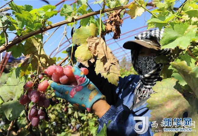 8月22日,在中衛(wèi)市沙坡頭區(qū)一家生態(tài)養(yǎng)殖基地,工作人員在采摘葡萄。該養(yǎng)殖基地經改造沙漠建成,占地500余畝,目前已發(fā)展葡萄種植、肉牛、奶牛養(yǎng)殖等產業(yè)。新華社記者任鵬飛攝