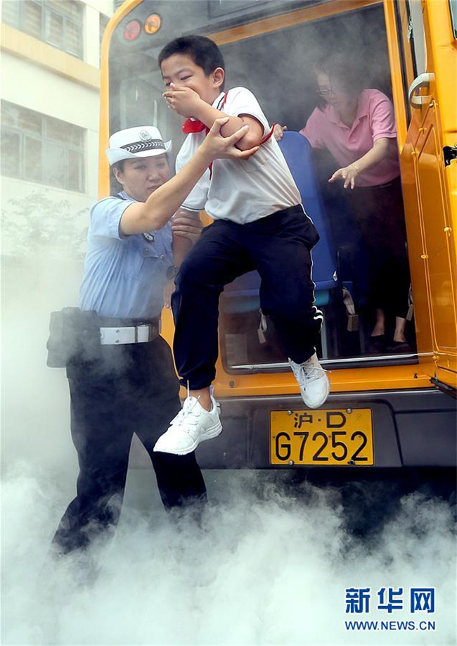 9月3日,民警在校車應(yīng)急疏散演練環(huán)節(jié)指導(dǎo)小學(xué)生從“起火”的校車中緊急疏散。
