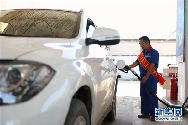 9月3日,江蘇省連云港市一家加油站的工作人員給車輛加油。 當(dāng)日,國家發(fā)展改革委發(fā)布消息,按照現(xiàn)行成品油價格形成機(jī)制,自2018年9月3日24時起,國內(nèi)汽油、柴油價格每噸分別上調(diào)180元和170元。 新華社發(fā)(王春 攝)