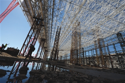 昨日,工作人員在為鋼結(jié)構(gòu)屋頂最后的一次提升做準(zhǔn)備。