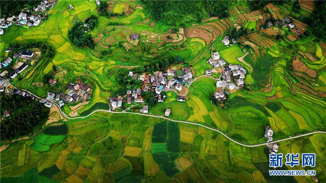 廣西隆林各族自治縣克長(zhǎng)鄉(xiāng)田園景色(9月1日無人機(jī)拍攝)。