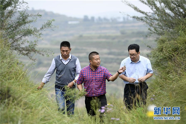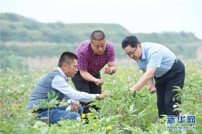 來自福建長樂的林錦云(中)在寧夏固原市河川鄉(xiāng)與福建對口支援農(nóng)業(yè)專家(右)交流牡丹種植技術(shù)(8月28日攝)。2014年,林錦云通過土地流轉(zhuǎn)方式,承包了河川鄉(xiāng)1.5萬畝荒山,打造油用牡丹生產(chǎn)基地。目前,林錦云種下的7600畝油用牡丹已經(jīng)開始產(chǎn)生效益,公司已就近吸納村民300多人就業(yè),其中建檔立卡戶39戶,人均年收入2萬多元。 新華社記者姜克紅攝