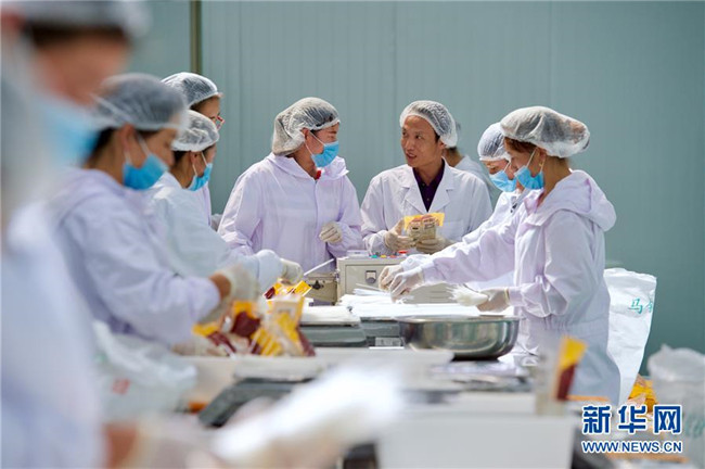 黃玉仁(右三)在寧夏固原市隆德縣寧夏黃土地農(nóng)業(yè)食品有限公司與員工交流馬鈴薯產(chǎn)品包裝注意事項(8月29日攝)。來自福建莆田的黃玉仁2017年在隆德縣創(chuàng)辦寧夏黃土地農(nóng)業(yè)食品有限公司,利用當(dāng)?shù)伛R鈴薯種植優(yōu)勢,制作馬鈴薯深加工產(chǎn)品,促進(jìn)當(dāng)?shù)伛R鈴薯銷售和農(nóng)民增收。目前公司已建成4條生產(chǎn)線,為當(dāng)?shù)?0多名百姓解決就業(yè)。 新華社記者姜克紅攝