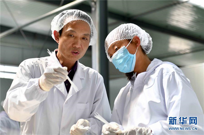 黃玉仁(左)在寧夏固原市隆德縣寧夏黃土地農(nóng)業(yè)食品有限公司與員工交流馬鈴薯粉絲制作技術(shù)(8月29日攝)。來自福建莆田的黃玉仁2017年在隆德縣創(chuàng)辦寧夏黃土地農(nóng)業(yè)食品有限公司,利用當(dāng)?shù)伛R鈴薯種植優(yōu)勢,制作馬鈴薯深加工產(chǎn)品,促進(jìn)當(dāng)?shù)伛R鈴薯銷售和農(nóng)民增收。目前公司已建成4條生產(chǎn)線,為當(dāng)?shù)?0多名百姓解決就業(yè)。 新華社記者郭緒雷攝