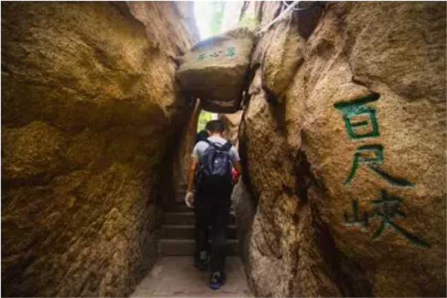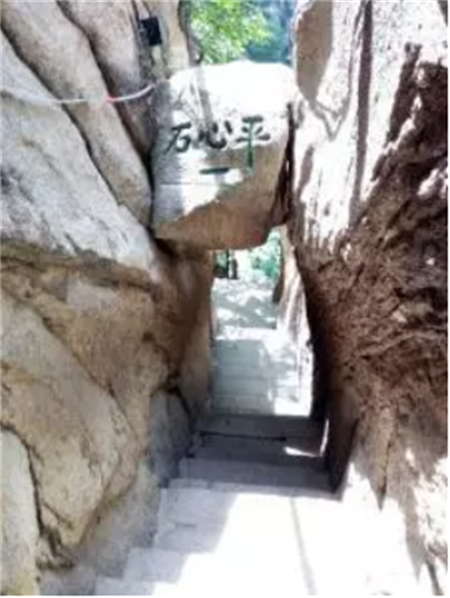 過千尺幢就是百尺峽。說千尺幢艱險(xiǎn),是每個(gè)爬華山的人都能體驗(yàn)得到的,而百尺峽就不是那樣的險(xiǎn)要了。但當(dāng)你上了百尺峽以后,眼前的一幕會(huì)讓人產(chǎn)生驚訝和不安。原來,在兩壁夾縫處有一塊懸石,似落非落的樣子,上面寫著“驚心石”三個(gè)字。人須從石下穿過,讓人不由得擔(dān)心它的穩(wěn)定性來,許多人產(chǎn)生畏葸不前的情緒來。待鼓足勇氣從石頭下走過去,回頭一看,又有“平心石”三個(gè)字在石頭上,才知是庸人自擾,虛驚一場(chǎng)。