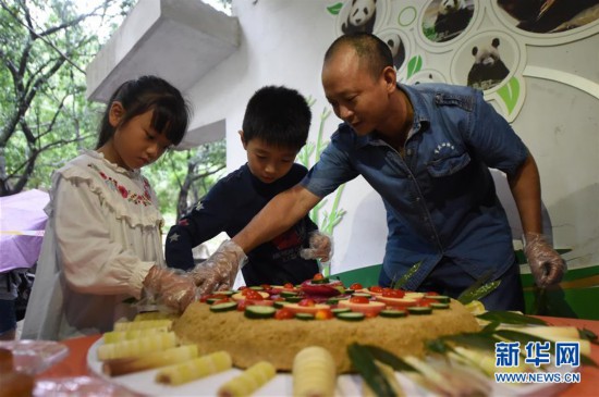 9月24日,在重慶動物園,工作人員與小朋友為大熊貓“新星”手工特制“月餅”。 當(dāng)日是中秋節(jié),重慶動物園工作人員邀請小朋友與36歲的大熊貓“新星”一同過中秋節(jié)。在工作人員的指導(dǎo)下,小朋友們用水果、蔬菜和麥粑特制一份月餅送給“新星”。 新華社記者唐奕攝