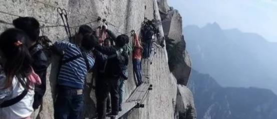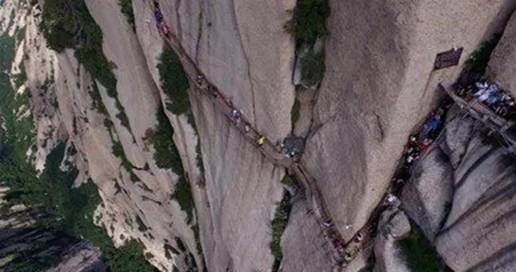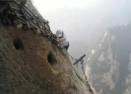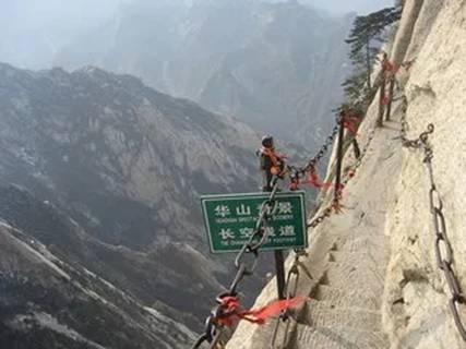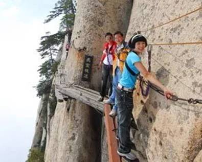 在約2160米高的峭壁上鑿出踏腳之處,鑲嵌石釘搭木椽并用鐵索固定建造的一條懸空棧道,那就是長空棧道。它位于華山極頂南峰東側(cè)南天門外的山腰間,經(jīng)燕子叼表、朝元洞,踩崖隙凌空懸梯下10余華山長空棧道米,沿附懸崖而搭寬不盈尺的方木棧道至全真巖下。